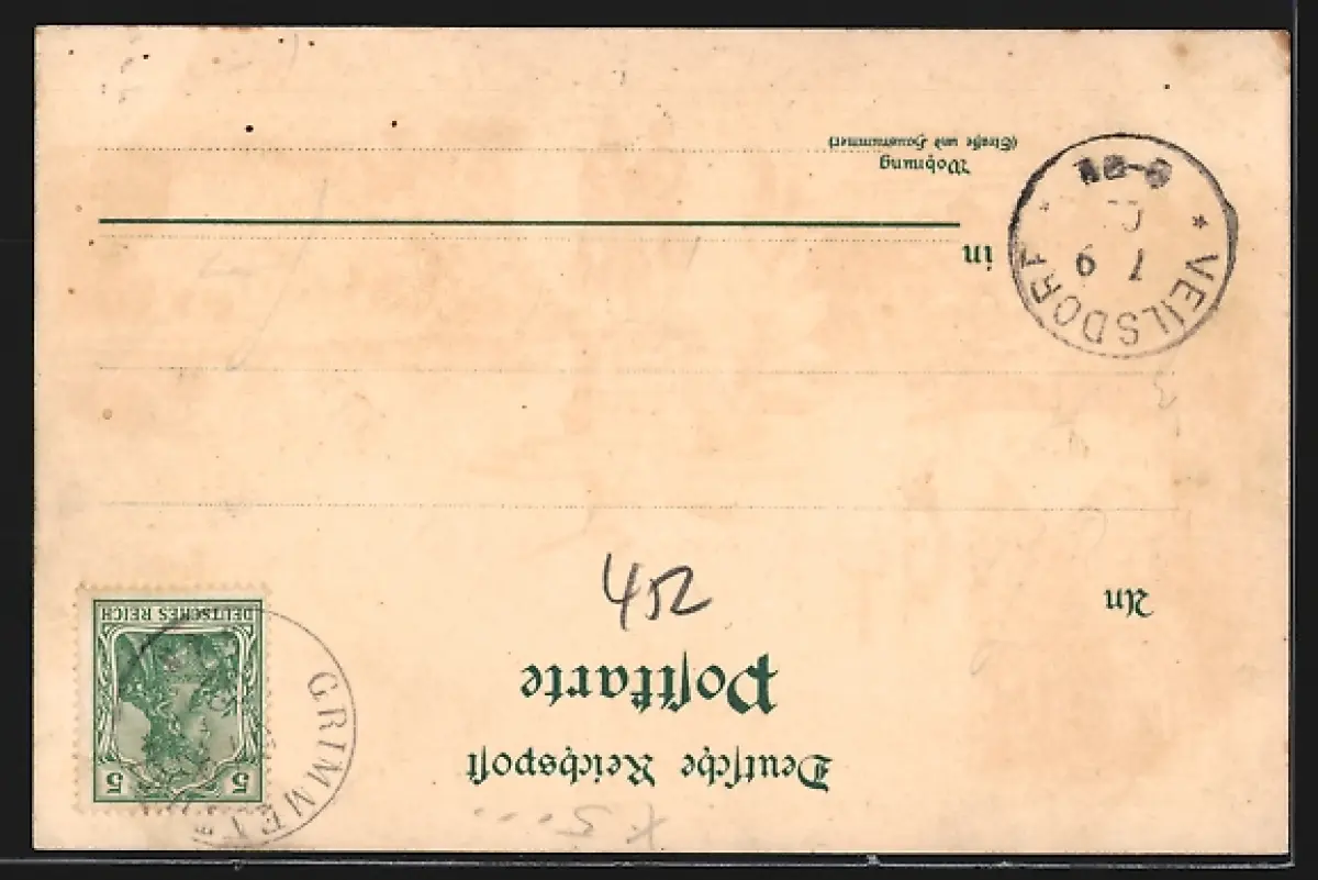 Personenbezogene Daten auf der Rückseite der Karte wurden durch blauen Textmarker unkenntlich gemacht. Die blauen Stellen sind auf die Vorderseite durchgeweicht und wirken sich negativ auf das Postkartenfoto aus