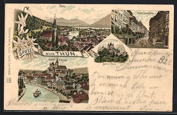 Lithographie Thun, Gesamtansicht, Obere Hauptgasse, Stadt-Schloss
