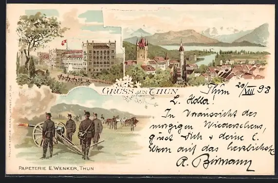 Lithographie Thun, Ortsansicht aus der Vogelschau
