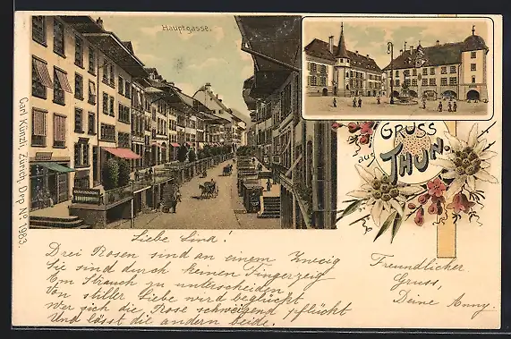 Lithographie Thun, Strassenpartie an der Hauptgasse, Marktplatz