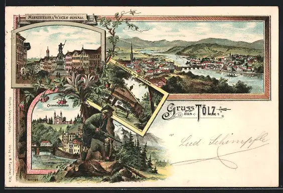 Lithographie Tölz, Gasthaus Reiterbauer am Buchberg, Marktstrasse & Winzer-Denkmal, Calvarienberg