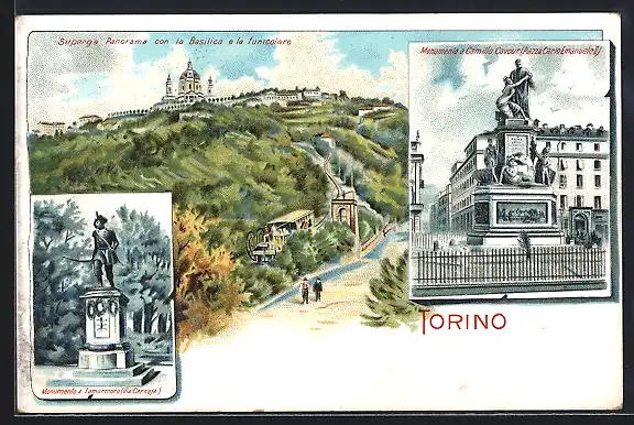 Lithographie Torino, Superga Panorama con la Basilica e la Funicolare, Monumento a Camillo Cavour, Monumento a Lamarmora