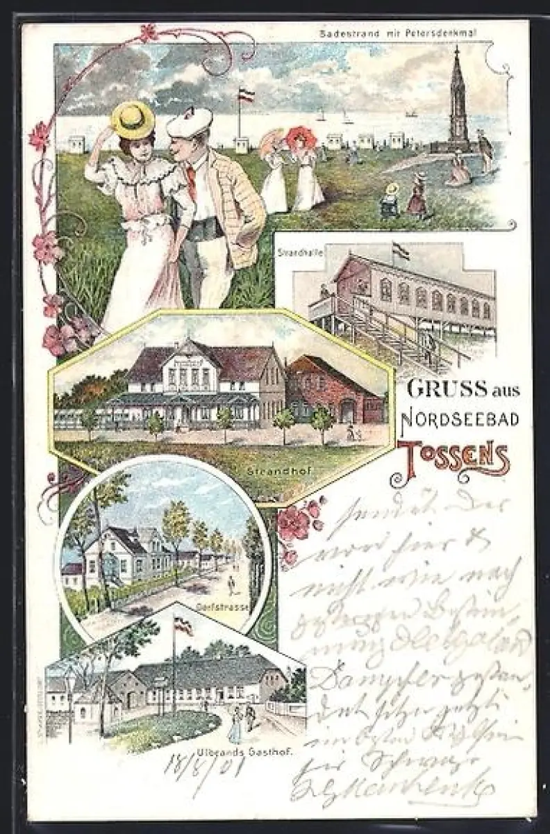 Lithographie Tossens, Ulbrands Gasthof, Hotel Strandhof, Strandhalle