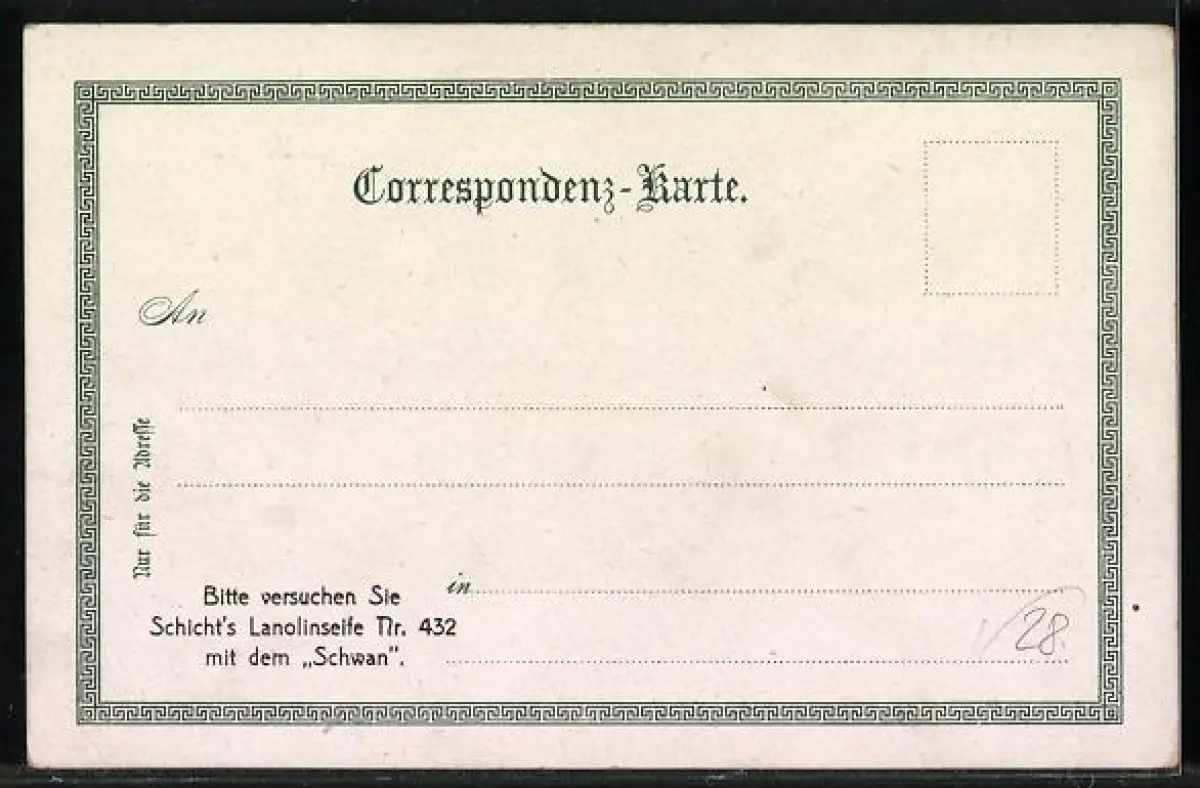 Personenbezogene Daten auf der Rückseite der Karte wurden durch blauen Textmarker unkenntlich gemacht. Die blauen Stellen sind auf die Vorderseite durchgeweicht und wirken sich negativ auf das Postkartenfoto aus