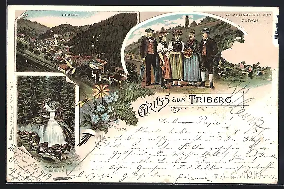 Lithographie Triberg, Wasserfall, Totalansicht, Volkstrachten von Gutach