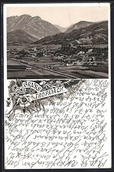 Lithographie Trofaiach, Totalansicht gegen die Berge