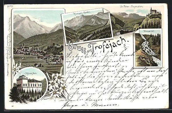 Lithographie Trofaiach, Wasserfall, Schloss Mell, Ortsansicht