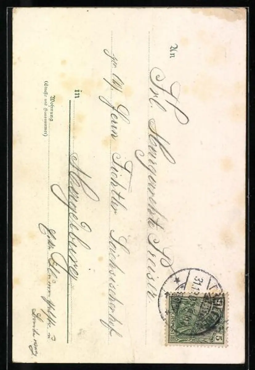 Personenbezogene Daten auf der Rückseite der Karte wurden durch blauen Textmarker unkenntlich gemacht. Die blauen Stellen sind auf die Vorderseite durchgeweicht und wirken sich negativ auf das Postkartenfoto aus