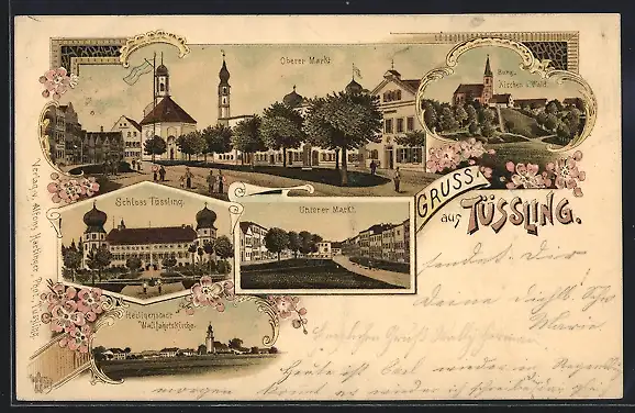 Lithographie Tüssling, Oberer und Unterer Markt, Schloss, Burg-Kirchen am Wald