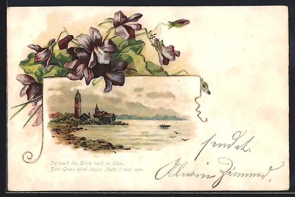 Lithographie Turm und Kirche am Ufer mit Veilchen, Ist auch die Karte noch so klein...