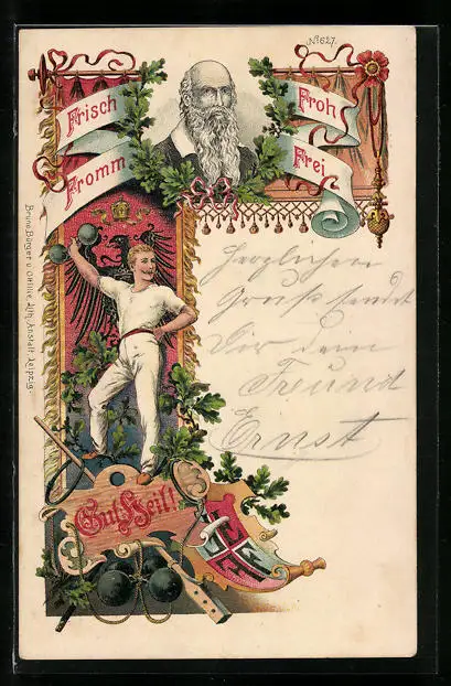 Lithographie Turnvater Jahn, Turnausrüstung, Eichenlaub