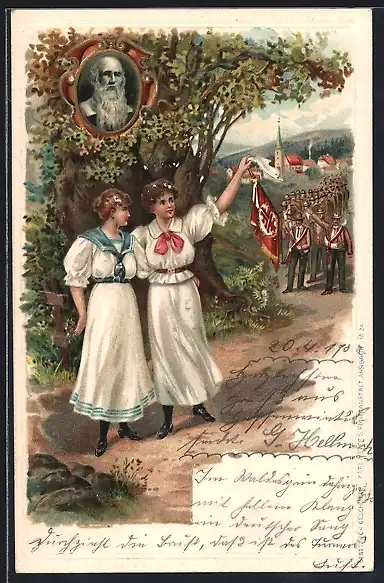 Lithographie Turnvater Jahn, Turner Parade, Frauen winken mit Fahne