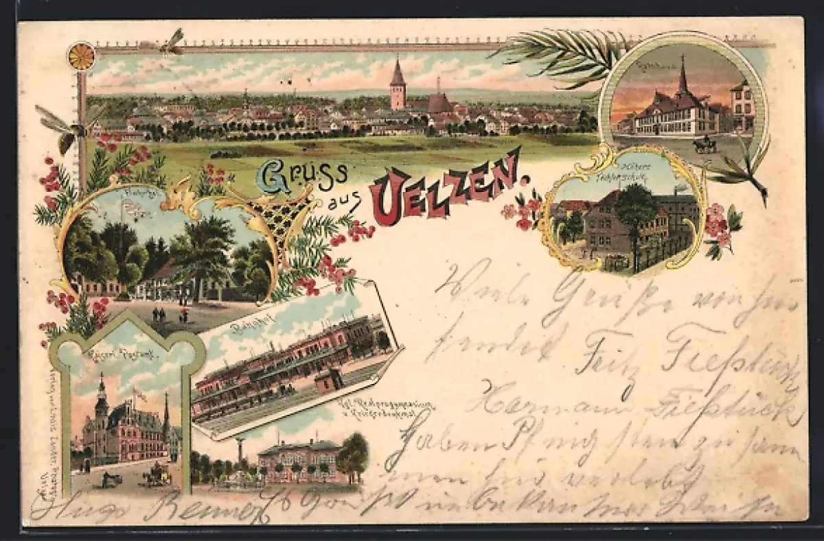 Lithographie Uelzen, Bahnhof, Restaurant Fischerhof, Postamt, Realgymnasium