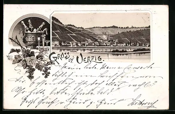 Lithographie Uerzig, Totalansicht, Stilleben mit Champagnerflaschen im Kübel