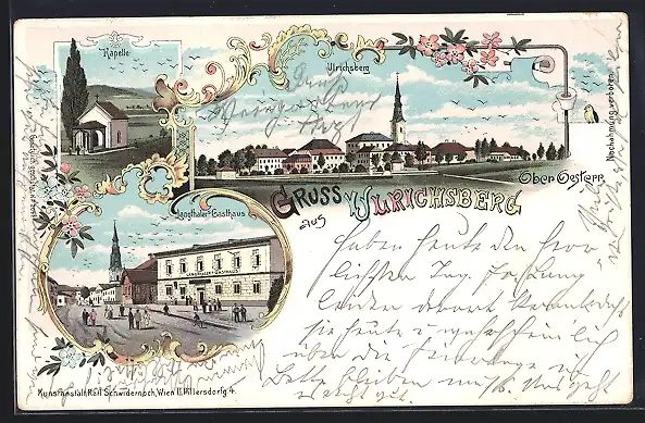 Lithographie Ulrichsberg /O.-Oe., Langthaler`s Gasthaus und Blick auf Kapelle
