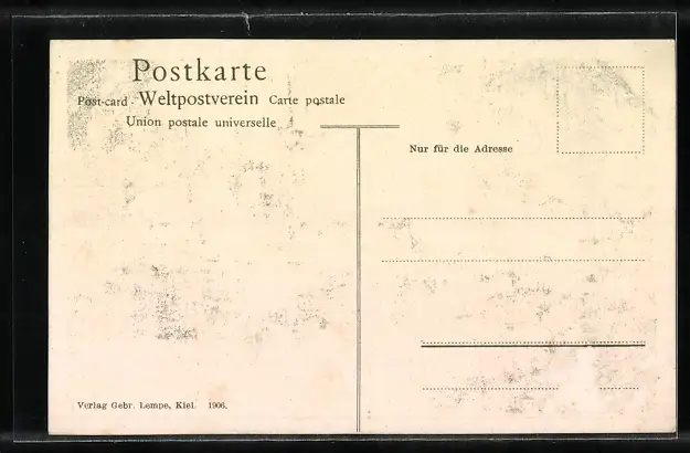 Personenbezogene Daten auf der Rückseite der Karte wurden durch blauen Textmarker unkenntlich gemacht. Die blauen Stellen sind auf die Vorderseite durchgeweicht und wirken sich negativ auf das Postkartenfoto aus