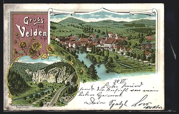 Lithographie Velden a. P., Partie rother Felsen im Pegnitzthal, Ortsansicht