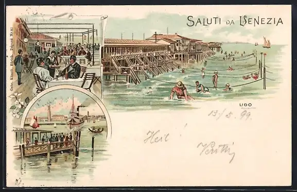 Lithographie Venezia, Anleger, Partie am Badestrand