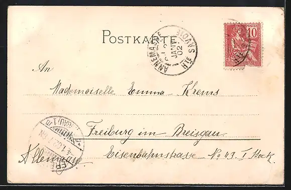 Personenbezogene Daten auf der Rückseite der Karte wurden durch blauen Textmarker unkenntlich gemacht. Die blauen Stellen sind auf die Vorderseite durchgeweicht und wirken sich negativ auf das Postkartenfoto aus