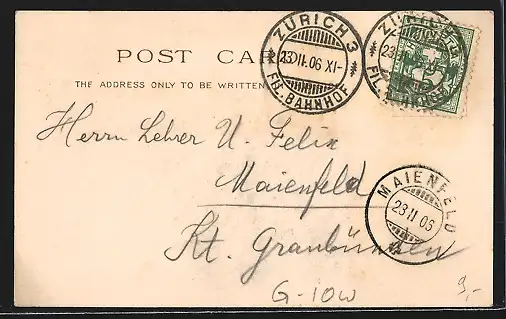 Personenbezogene Daten auf der Rückseite der Karte wurden durch blauen Textmarker unkenntlich gemacht. Die blauen Stellen sind auf die Vorderseite durchgeweicht und wirken sich negativ auf das Postkartenfoto aus