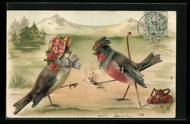 Lithographie Vermenschlichte Vögel, Wanderer schenkt einer Dame Blumen