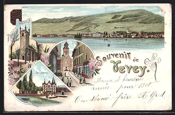 Lithographie Vevey, Le Château, Rue d`Italie, St. Martin, Panorama