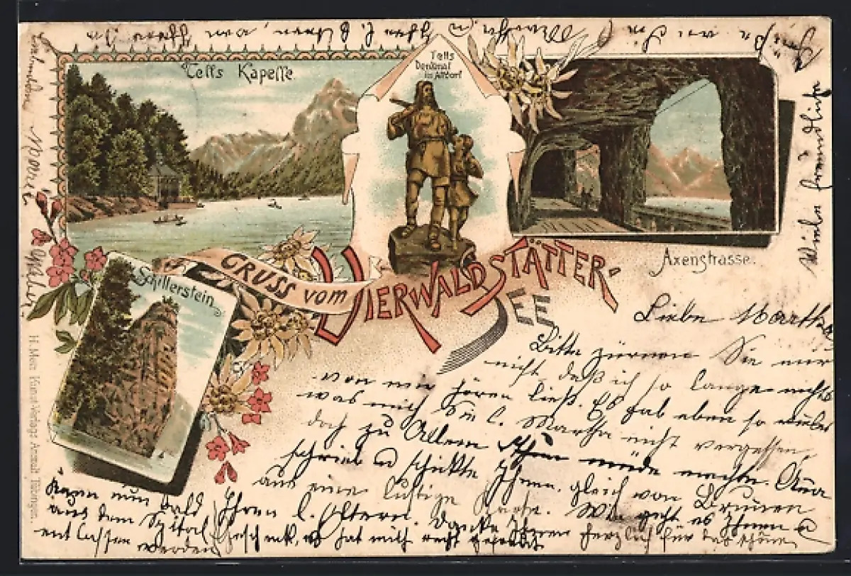 Lithographie Vierwaldstätter See, Tellskapelle, Axenstrasse, Schillerstein