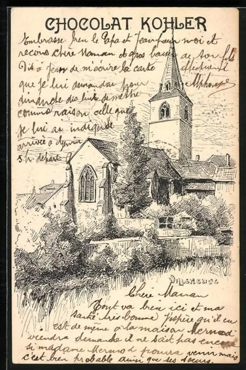 Lithographie Villeneuve, Reklame Chocolate Kohler, Eglise