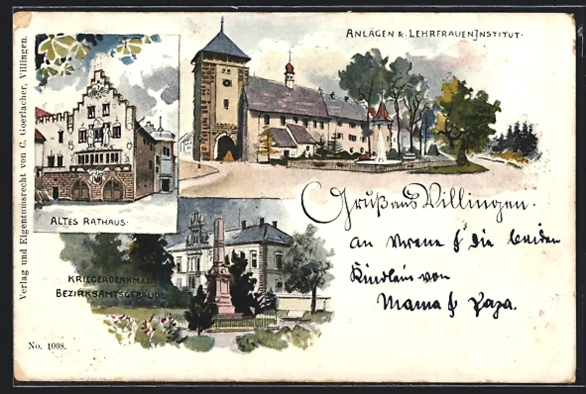 Lithographie Villingen / Baden, Altes Rathaus, Anlagen & Lehrfraueninstitut