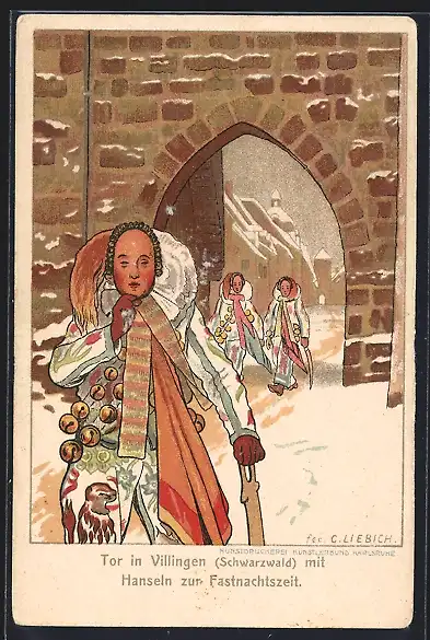 Lithographie Villingen /Schwarzwald, Tor mit Hanseln zur Fastnachtszeit