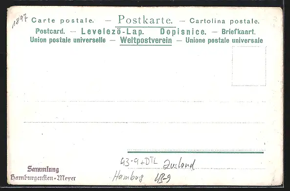Personenbezogene Daten auf der Rückseite der Karte wurden durch blauen Textmarker unkenntlich gemacht. Die blauen Stellen sind auf die Vorderseite durchgeweicht und wirken sich negativ auf das Postkartenfoto aus