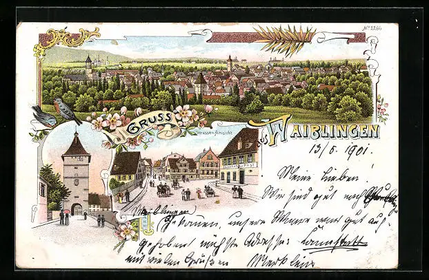 Lithographie Waiblingen, Totalansicht, Strassenpartie, Torbogen