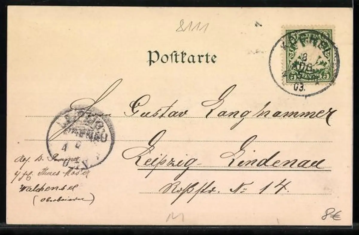 Personenbezogene Daten auf der Rückseite der Karte wurden durch blauen Textmarker unkenntlich gemacht. Die blauen Stellen sind auf die Vorderseite durchgeweicht und wirken sich negativ auf das Postkartenfoto aus