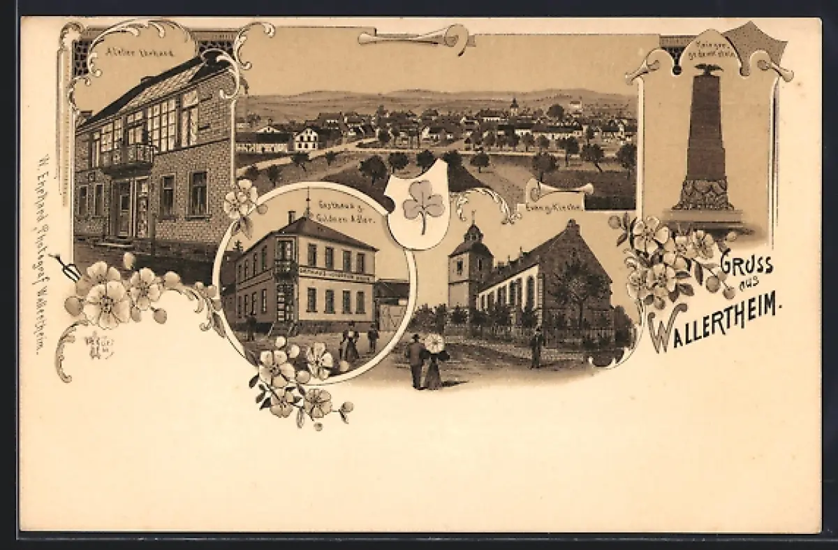 Lithographie Wallertheim / Rheinhessen, Gasthaus zum Goldnen Adler, Evang. Kirche, Atelier Erhard