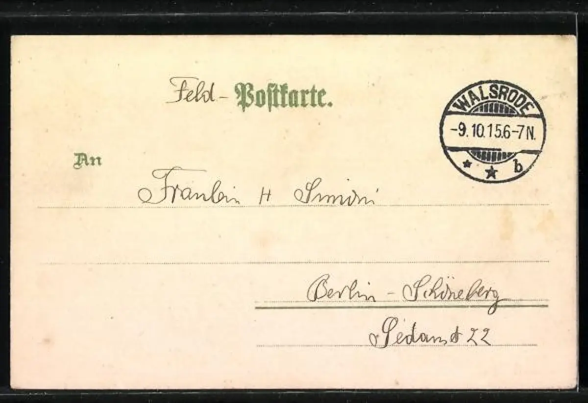 Personenbezogene Daten auf der Rückseite der Karte wurden durch blauen Textmarker unkenntlich gemacht. Die blauen Stellen sind auf die Vorderseite durchgeweicht und wirken sich negativ auf das Postkartenfoto aus