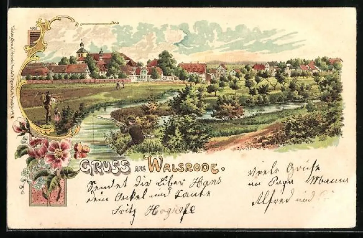 Lithographie Walsrode, Ortsansicht mit Flusslauf und Angler