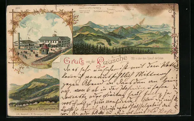 Lithographie Waltersdorf, Berggasthof Lausche, Gebirgspanorama, Ansicht v. d. Sängerhöhe