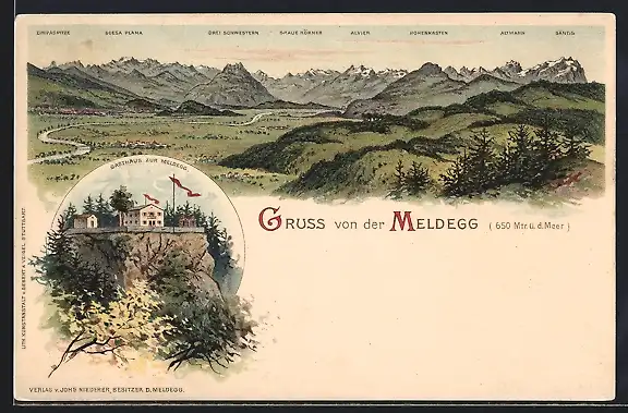 Lithographie Walzenhausen, Gasthaus zur Meldegg, Gebirgspanorama