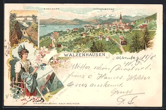 Lithographie Walzenhausen, Ortsansicht mit Bodensee gegen Vorarlberge