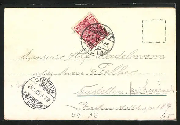 Personenbezogene Daten auf der Rückseite der Karte wurden durch blauen Textmarker unkenntlich gemacht. Die blauen Stellen sind auf die Vorderseite durchgeweicht und wirken sich negativ auf das Postkartenfoto aus