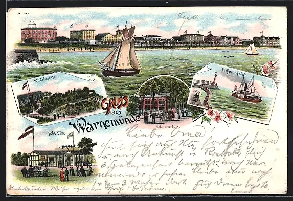 Lithographie Warnemünde, Gasthaus Schweizerhaus, Hafeneinfahrt mit Dampfer, Gasthaus Wilhelmshöhe