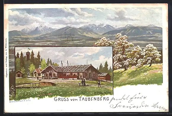 Lithographie Warngau, Gasthaus auf dem Taubenberg, Alpenpanorama