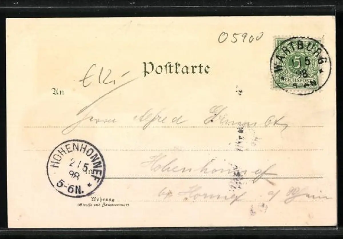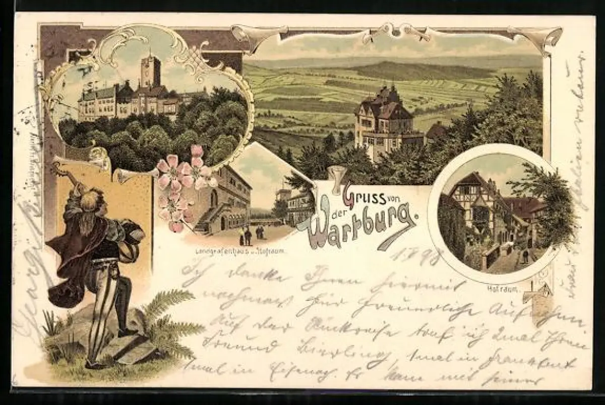 Lithographie Wartburg, Ansicht der Burg und Umgebung, Hofraum und Landgrafenhaus