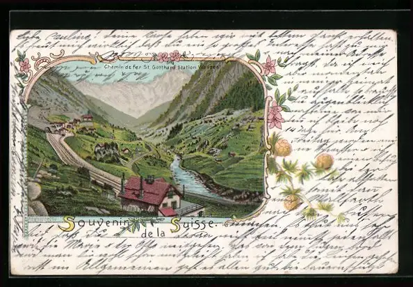 Lithographie Wassen, Chemin de fer St. Gotthard Station Wassen