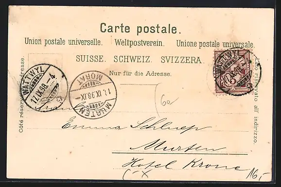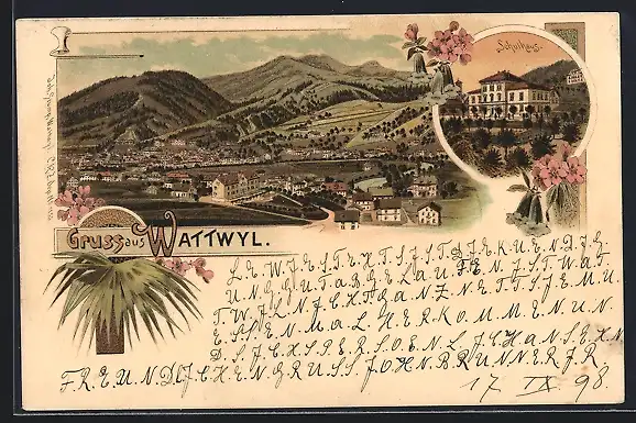 Lithographie Wattwyl, Schulhaus, Ortsansicht aus der Vogelschau