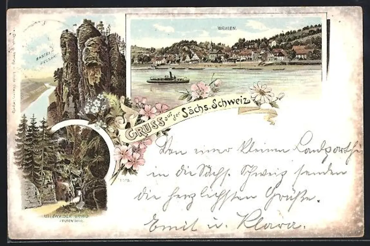 Lithographie Wehlen / Elbe, Bastei-Felsen, Dampferpartie