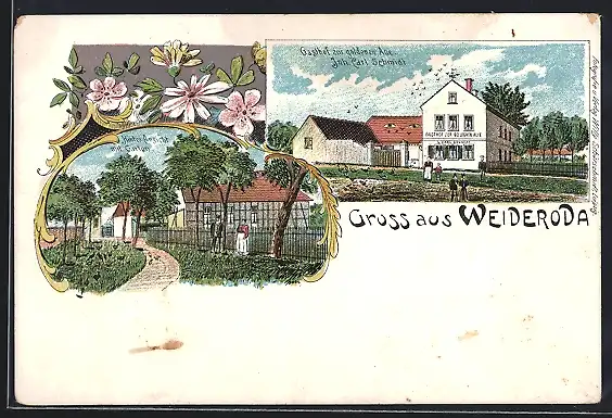 Lithographie Weideroda, Gasthof zur Goldenen Aue, Bes. Carl Schmidt, Von vorn und von hinten mit Garten