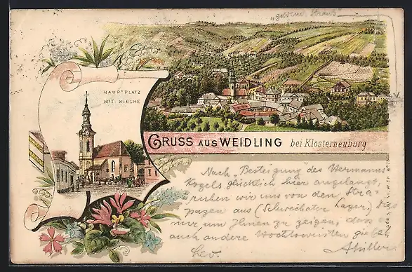 Lithographie Weidling bei Klosterneuburg, Hauptplatz mit Kirche, Totalansicht