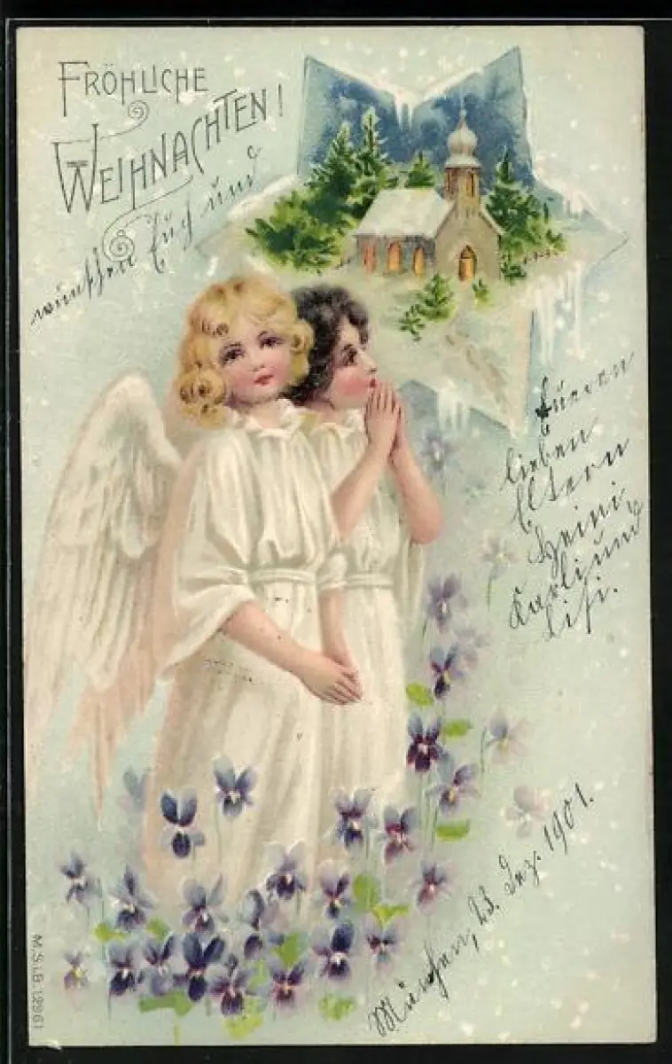 Lithographie Weihnachtsengel vor verschneiter Kirche, Veilchen, Fröhliche Weihnachten