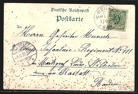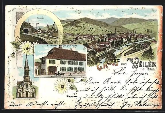 Lithographie Weiler b. Thann, Wirtschaft zum gold. Adler, Tunnel, Kirche, Ortsansicht